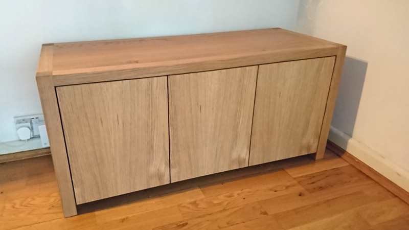 Oak shoe storage-bench finished with Danish oil. Doors are fitted on the concealed hinges, with push to open catches. Sizes: W940mm, H 450mm, D400mm