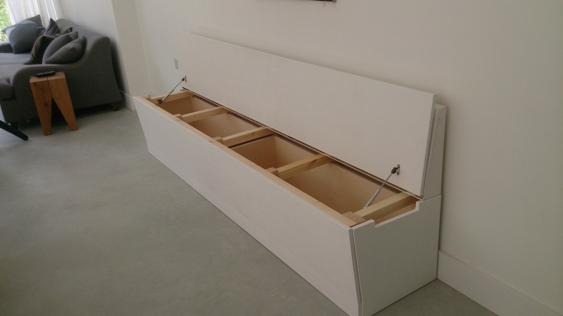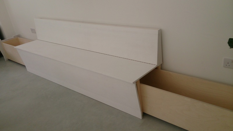 Bench-storage for the dining area made from painted Birch plywood and MDF.
