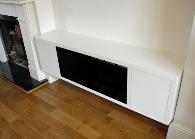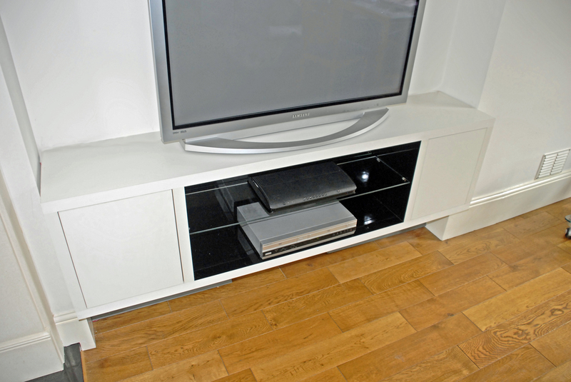 Media cabinet, contemporary design, push to open doors. White mat and black high gloss. Doors fitted with push-to-open mechanism. Sizes: W1800mm, H 420mm, D350mm