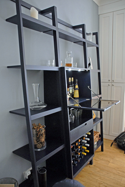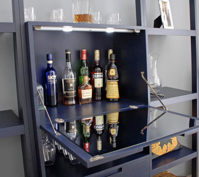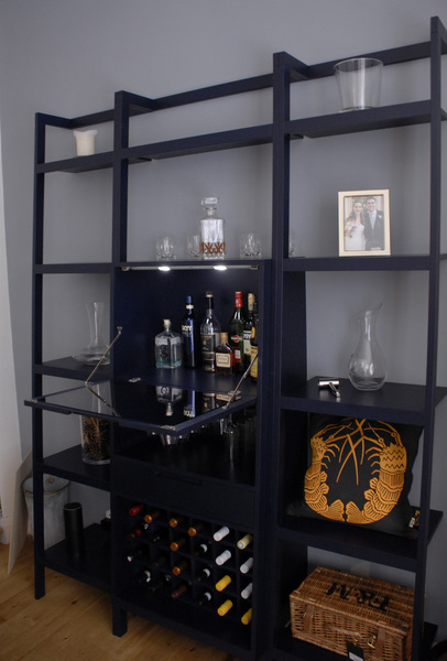 Solid Sapele and birch plywood shelving unit with bar, wine rack and wine glass holder. The bar is fitted with LED light and mirror, finished in dark Navy colour. H2.4M, W2.4M, max depth 600mm. Price £1500.00