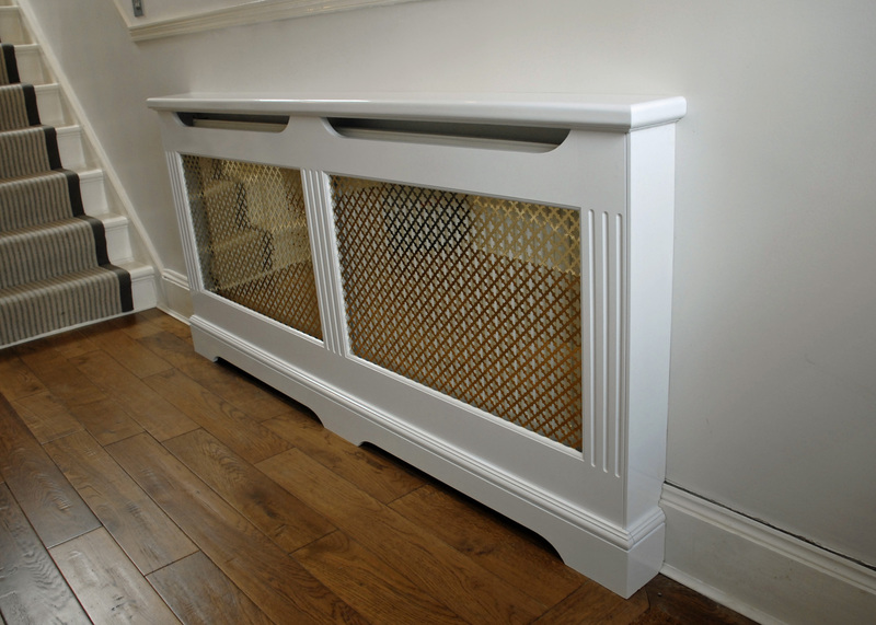 Large radiator cover, with removable panel brass grills. Hand painted white gloss. Sizes: W1800mm X H900mm X 160mm.