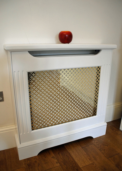 Small double radiator casing, with removable panel brass grill. Hand painted white gloss. Sizes: W850mm X H900mm X 220mm.