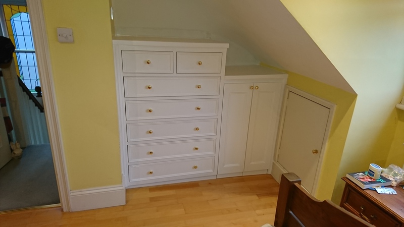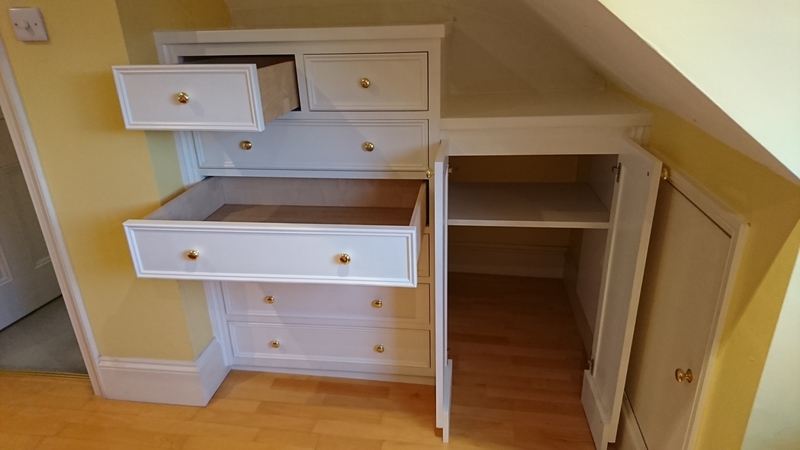 Chest of drawers and storage fitted in attic space. Made from hand painted MDF with birch plywood drawers fitted on soft close runners. Doors fitted on concealed hinges and brass knobs.gloss. Sizes: W1.7M X H1.3M X D0.5M