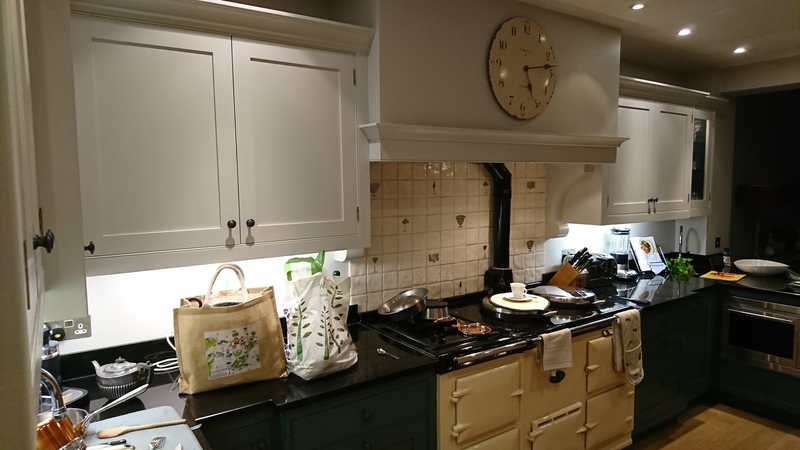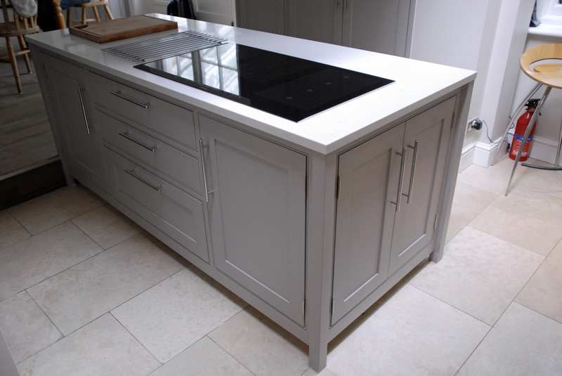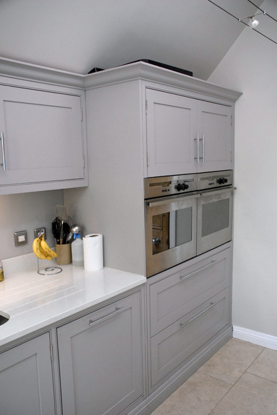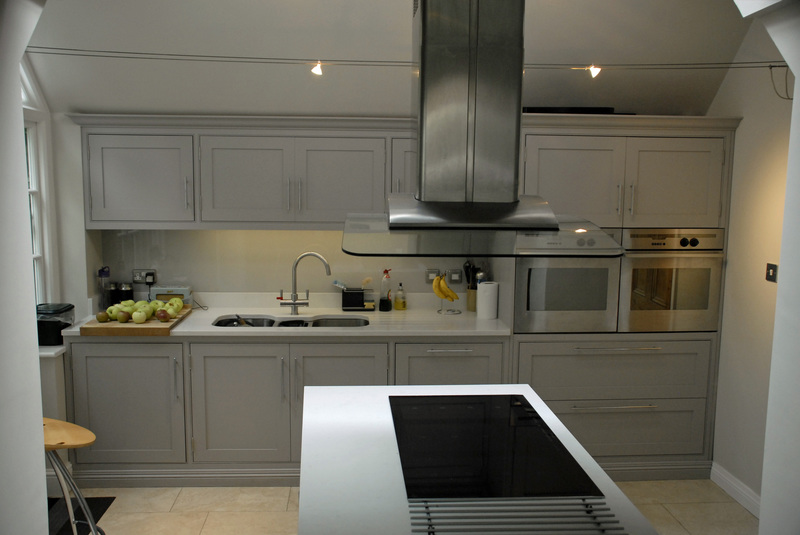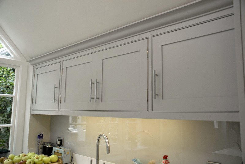In frame kitchen with Shaker style doors. Interior of cabinets in American black walnut, exteriors hand painted made from solid hard maple. Wall cabinets made to match sloping roof line. Doors fitted on polished nickel hinges and handles. Drawers made from solid American black walnut and fitted on soft close runners.