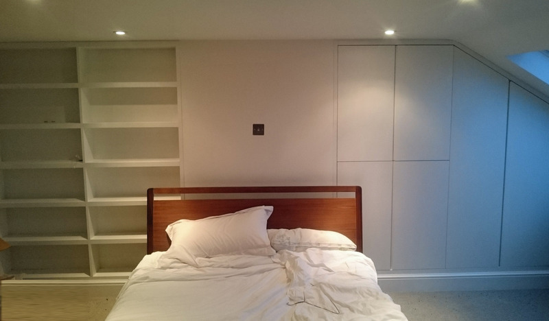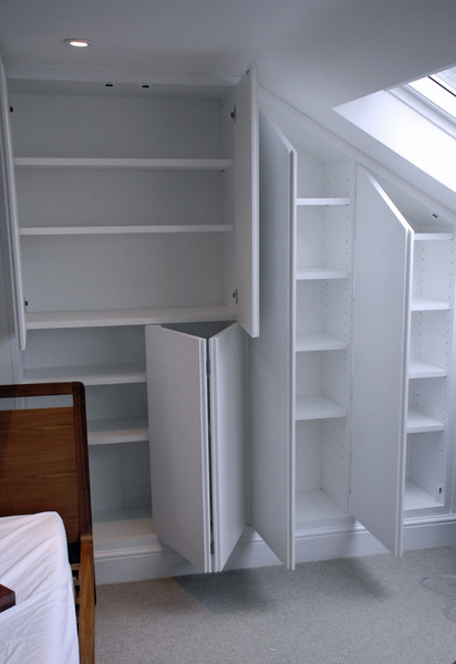 Alcove fitted cupboards for attic space. Hand painted Medite MDF. Cupboards divided in 3 compartments, 2 narrow shelving units and one wide behind double door. Bottom door are folding to the one side to avoid clashing with the beds headboard. Sizes: H 2 Meters, W1.9 Meter, D 390mm