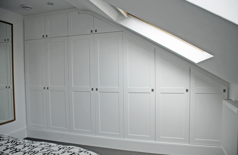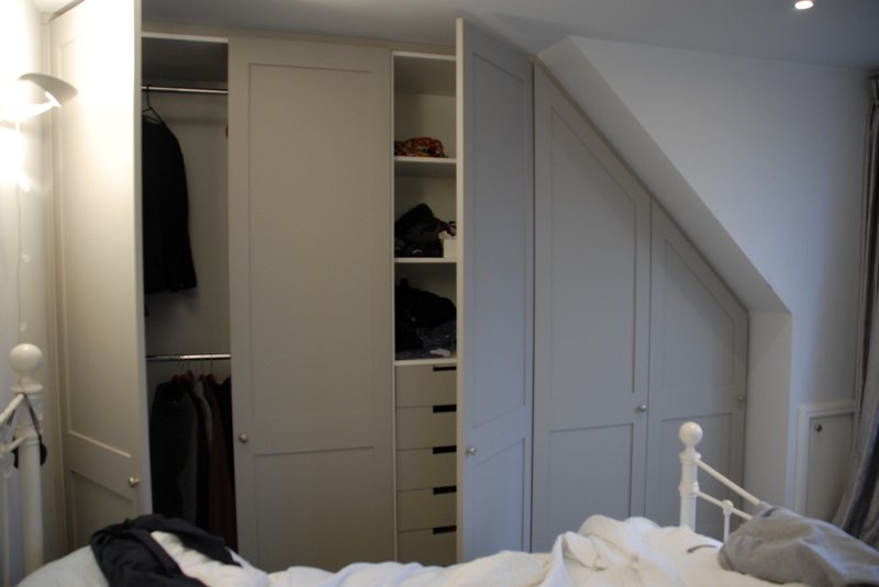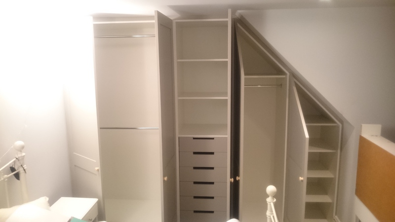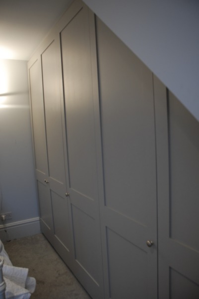Fitted wardrobes, for attic space. Hand painted Medite MDF doors with traditional knobs. Interior is made from white melamine. Inside: divided in 4 compartments, 6 drawers, adjustable shelves and hanging rails. Sizes: W3250mm, H 2450mm, D600mm