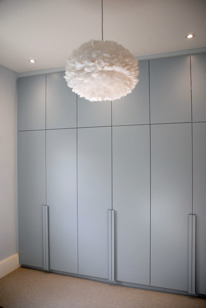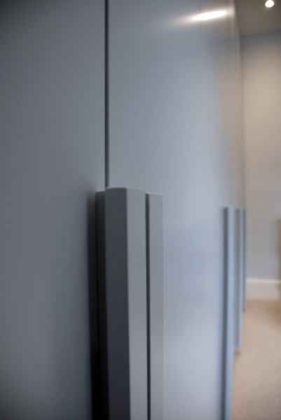 Fitted wardrobes, built in the front of the existing fire place recess. Spray painted Medite MDF doors with bespoke made handles. Doors are fitted with soft close hinges and drawers fitted on soft close runners. Top doors fitted with push-to open catches. Interior is made from Egger light gray MFC. Sizes: W4100mm, H 3000mm, D600mm