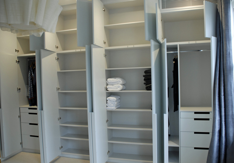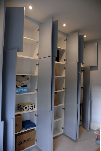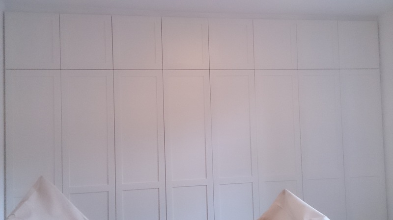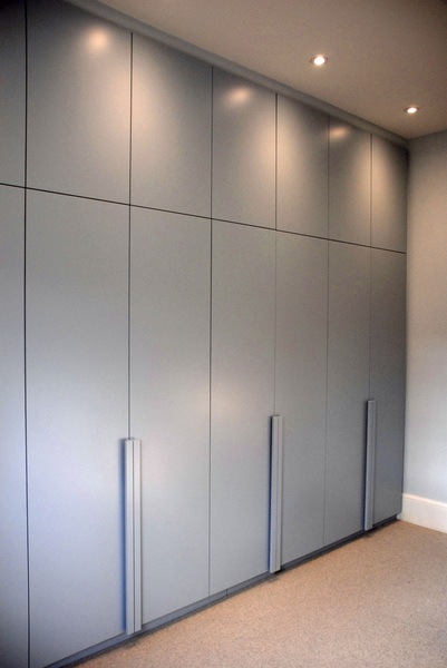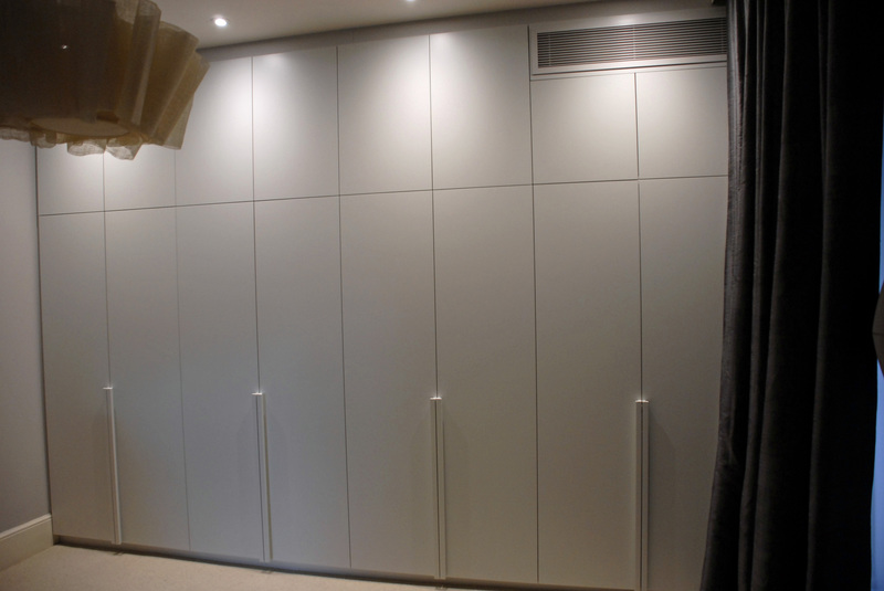 Fitted wardrobes, built in the front of the existing fire place recess. Spray painted Medite MDF doors with bespoke made handles. Doors are fitted with soft close hinges and drawers fitted on soft close runners. Top doors fitted with push-to open catches. Interior is made from white melamine MDF. Sizes: W4000mm, H 3000mm, D600mm