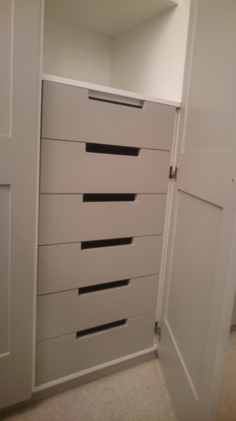 Fitted wardrobes, for attic space. Hand painted Medite MDF doors with contemporary flush ring handles. Interior is made from white melamine. Inside: divided in 5 compartments, 4 large drawers, shelves and hanging rails. Sizes: W3250mm, H 2450mm, D600mm